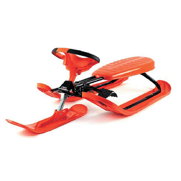 Снегокат в ярком броском дизайне обеспечивает отличную управляемость и хорошую скорость на склоне. Оснащение: буксировочный трос, пружина, обеспечивающая остановку снегоката в случае потери управления, тормоз.