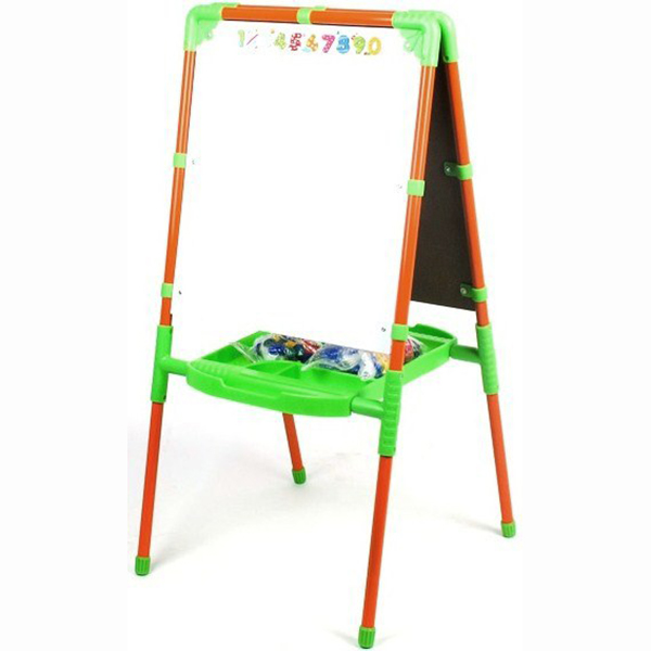Одна сторона мольберта - металл для работы с магнитной азбукой и рисования маркерами на водной основе, другая сторона - кашированный ДВП для рисования мелом.