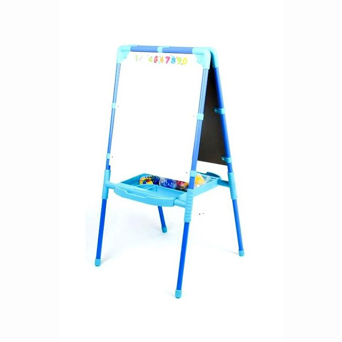 Одна сторона мольберта - металл для работы с магнитной азбукой и рисования маркерами на водной основе, другая сторона - кашированный ДВП для рисования мелом.