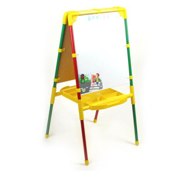Одна сторона мольберта - металл для работы с магнитной азбукой и рисования маркерами на водной основе, другая сторона - кашированный ДВП для рисования мелом.