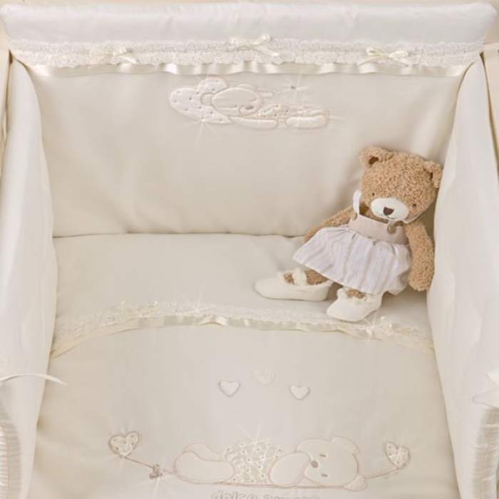 Комплект в кроватку 4 предмета Picci Mimmi - потрясающая ручная работа. Восхитительные россыпи вышитых на блестящем сатине цветов ручной работы кружево , причудливые узоры, фигуры, стразы не оставят равнодушным никого. Купив такое постельное белье, вы долгие годы будете наслаждаться его красотой и великолепием. Ведь сам материал не рвется и не садится, а вышивка не линяет и не растягивается. Удивительным образом подобранные узоры для вышивки размещены именно там, где они меньше всего мешают спящему человеку, и одновременно в том месте, где их лучше всего видно и где они заметно украшают общий дизайн постельного белья.